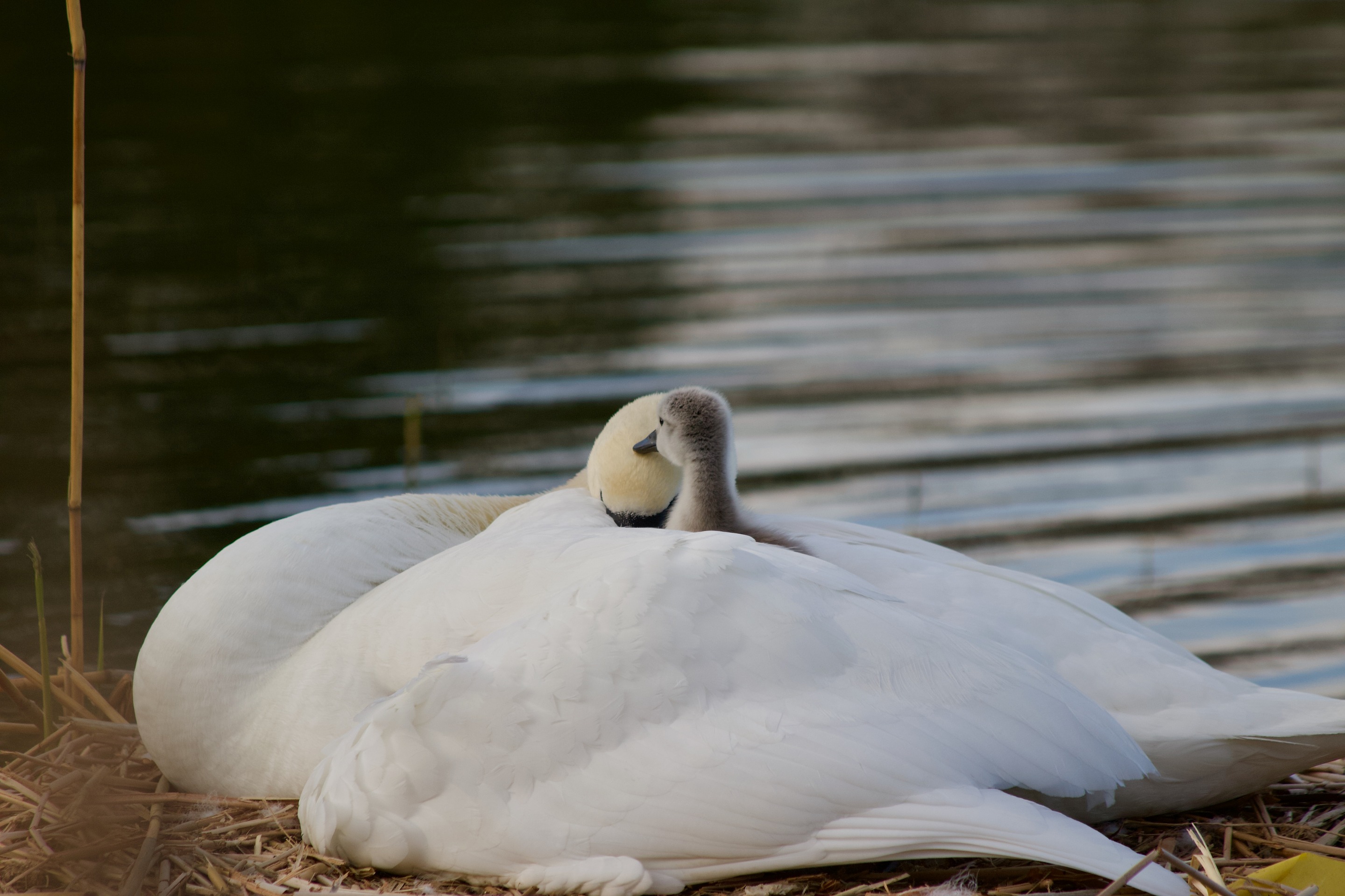 En liten svanunge tittar nyfiket upp mot världen, trygg under den stora svanens vakande blick.