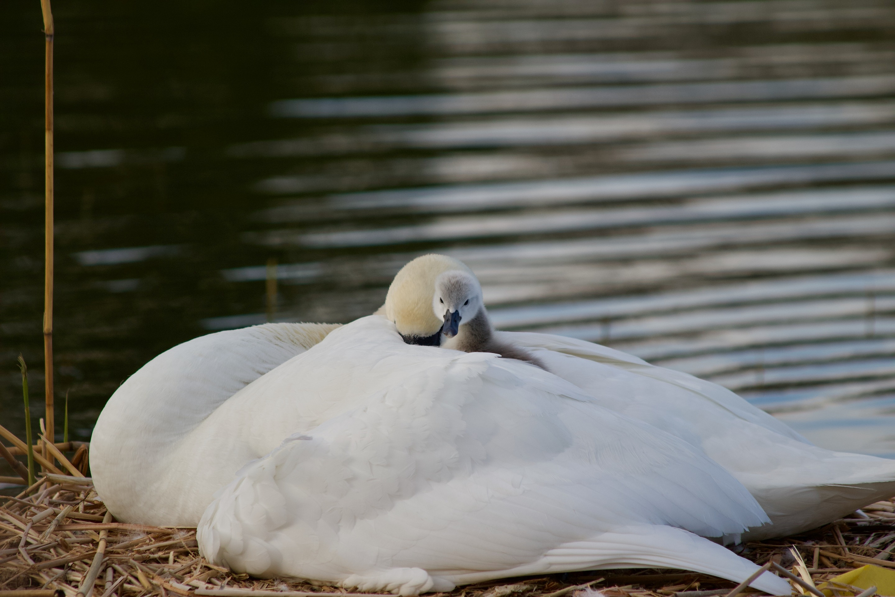 Nyfiken på livet utanför boet sträcker den lilla svanungen på sig, medan den stora svanen vilar stilla.