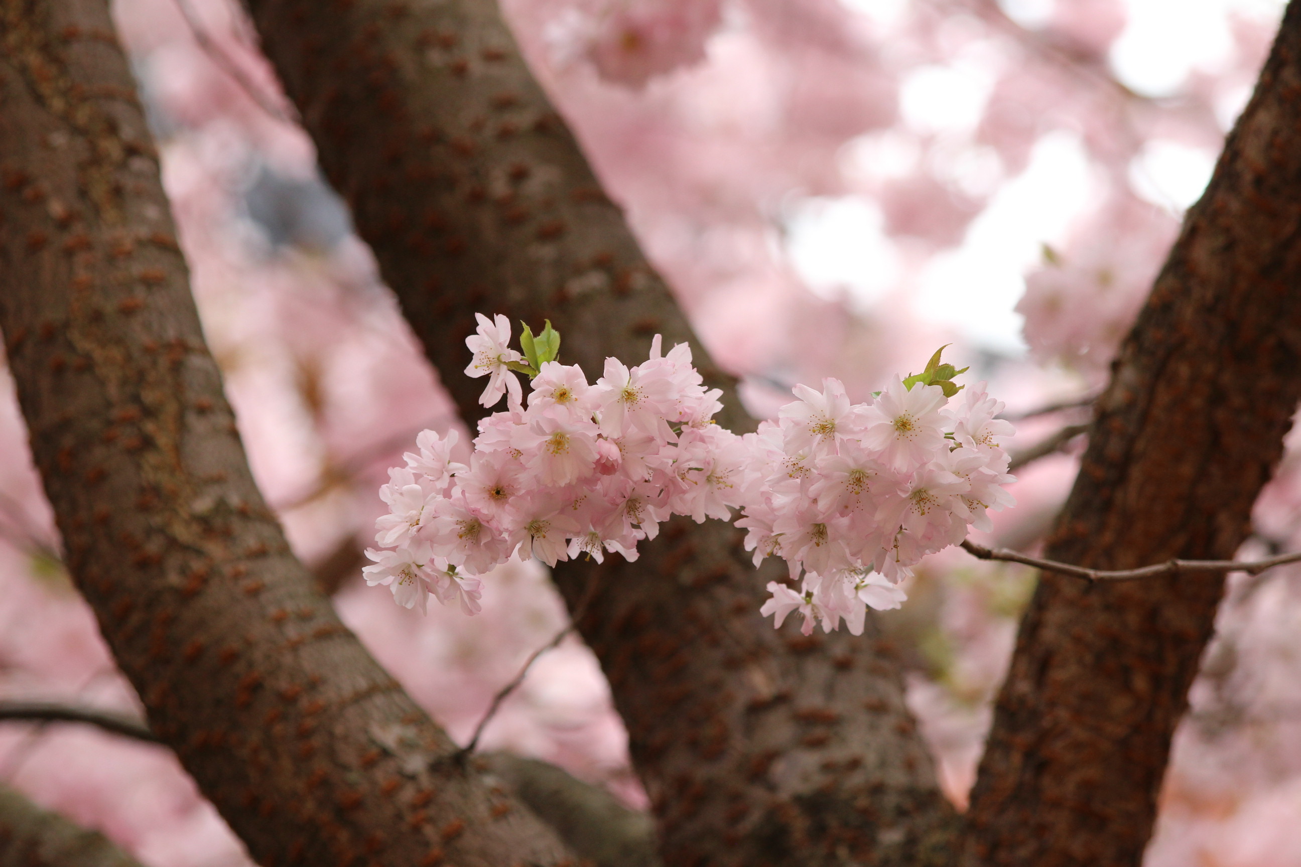 "Rosa blommor i sin fulla prakt balanserar mot trädets klyka, redo att släppa sina kronblad som mjuka andetag av våren."