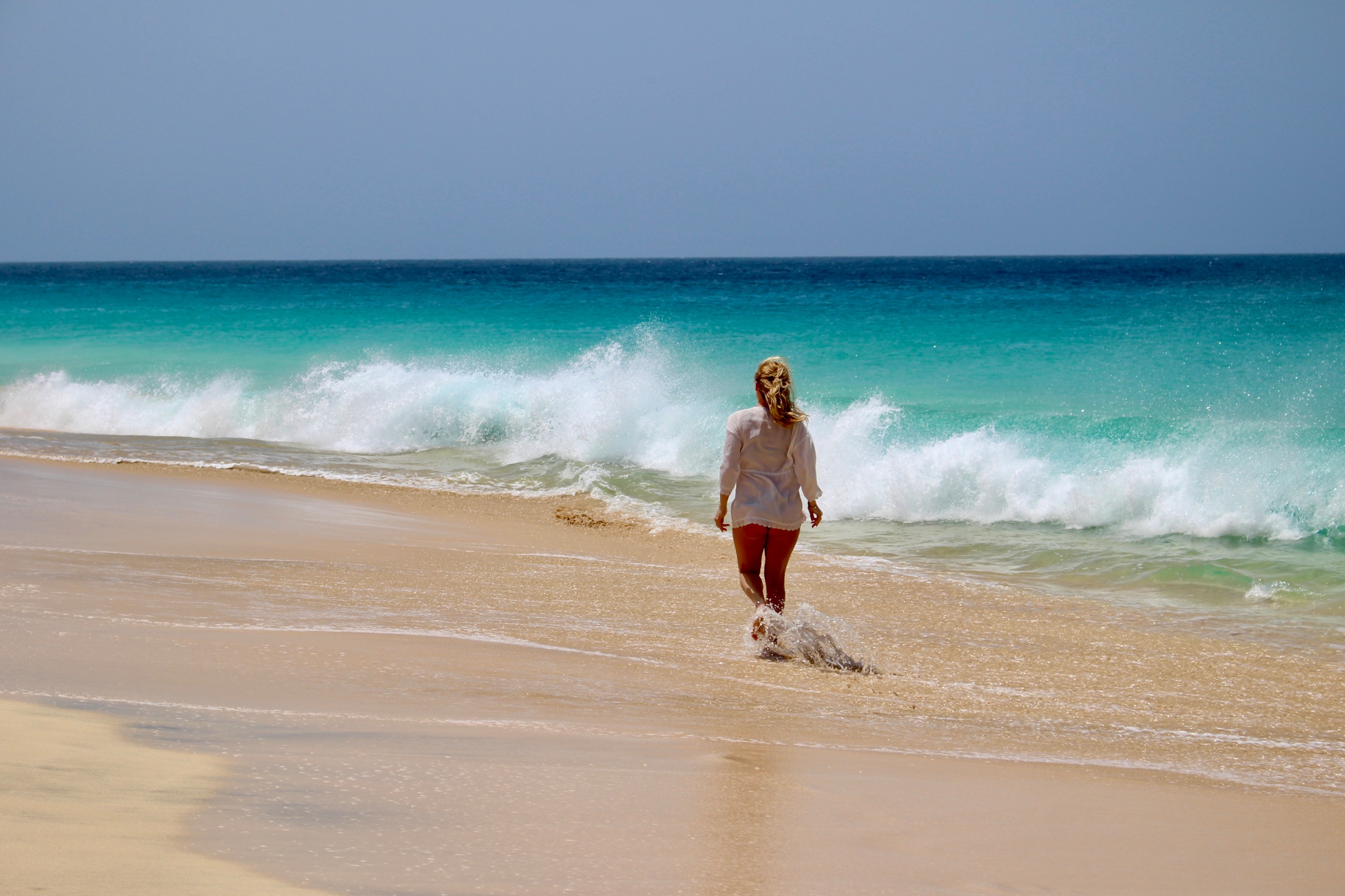 "I vitt som skummet vid hennes fötter går hon genom Santa Marias ljus, där varje steg blandar hav, vind och frihet."