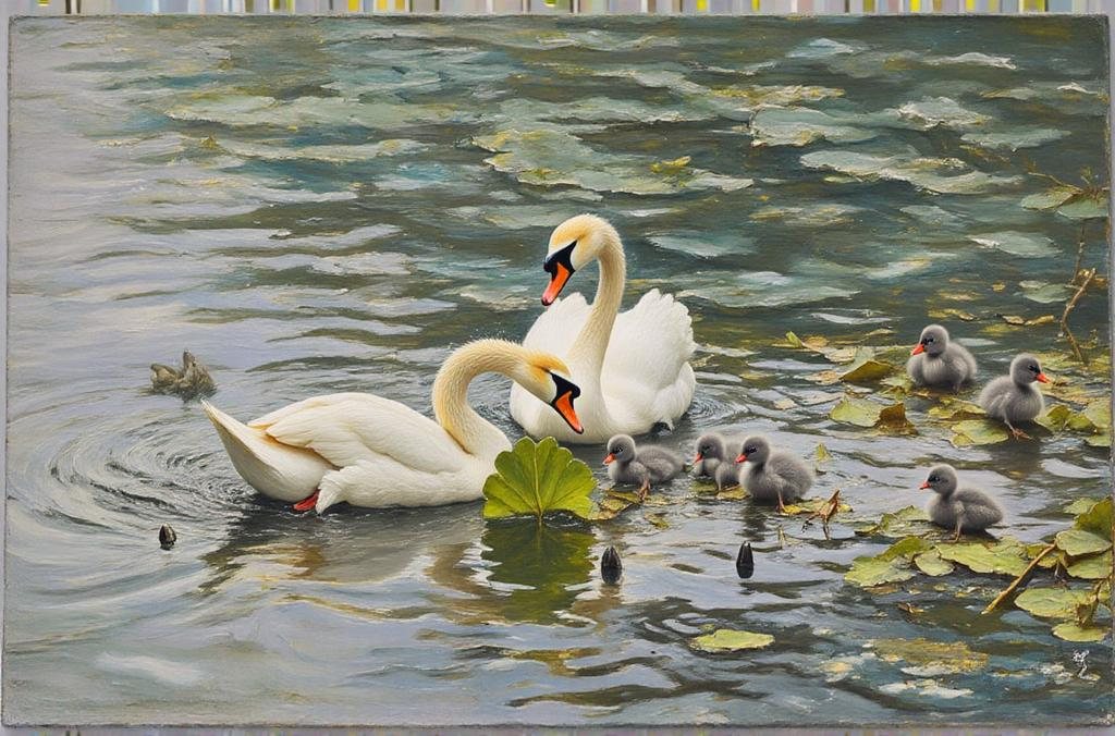 Sjö med en familj svanar bland näckrosblad.