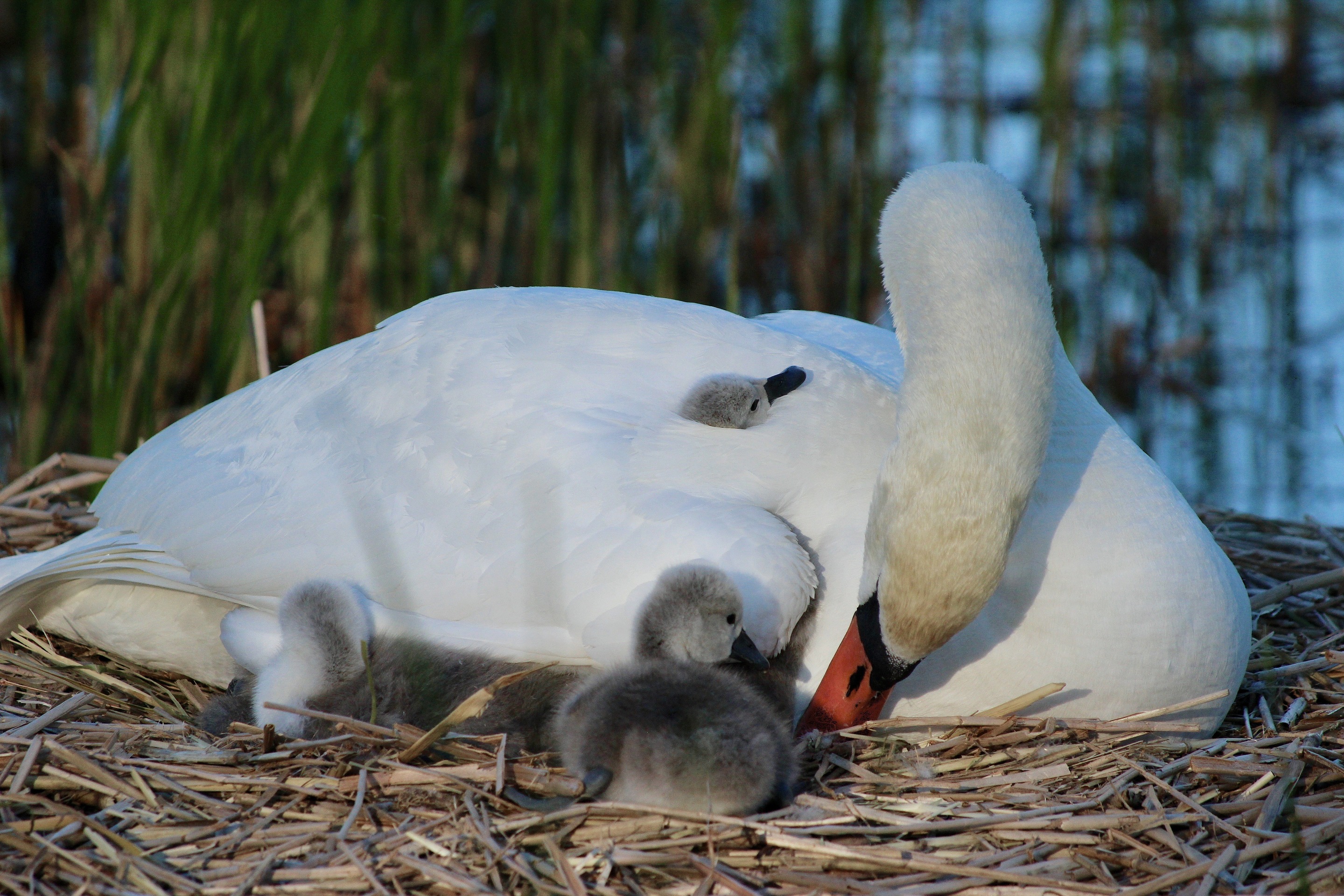 En vuxen svan omsluter sina ungar med sina vingar, där några ligger skyddade under kroppen och en unge tryggt vilar på ryggen, inlindad i dun. En hjärtvärmande bild som fångar omsorg, trygghet och närhet i naturen.