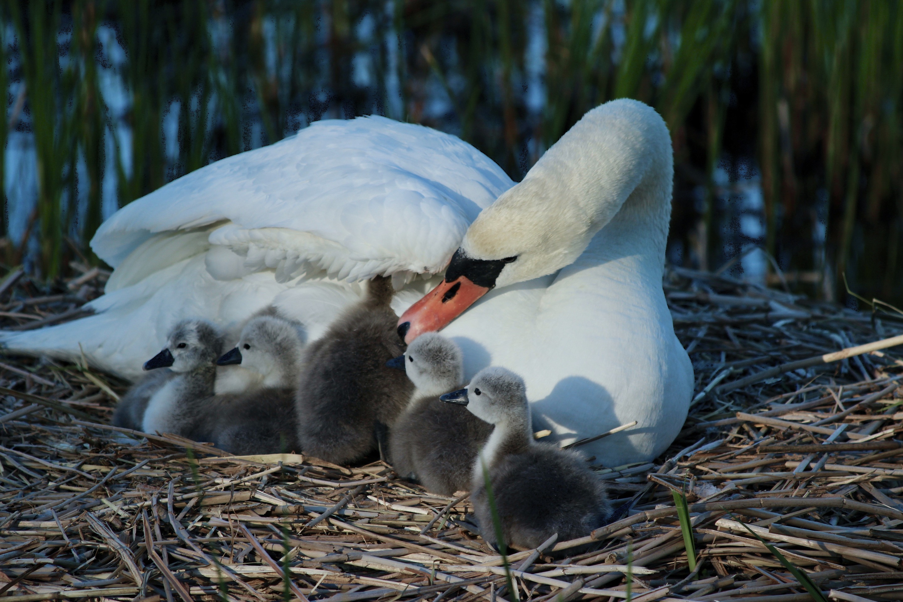 Vuxen svan tillsammans med sin ungar i boet, en lugn och skyddande stund i naturen.