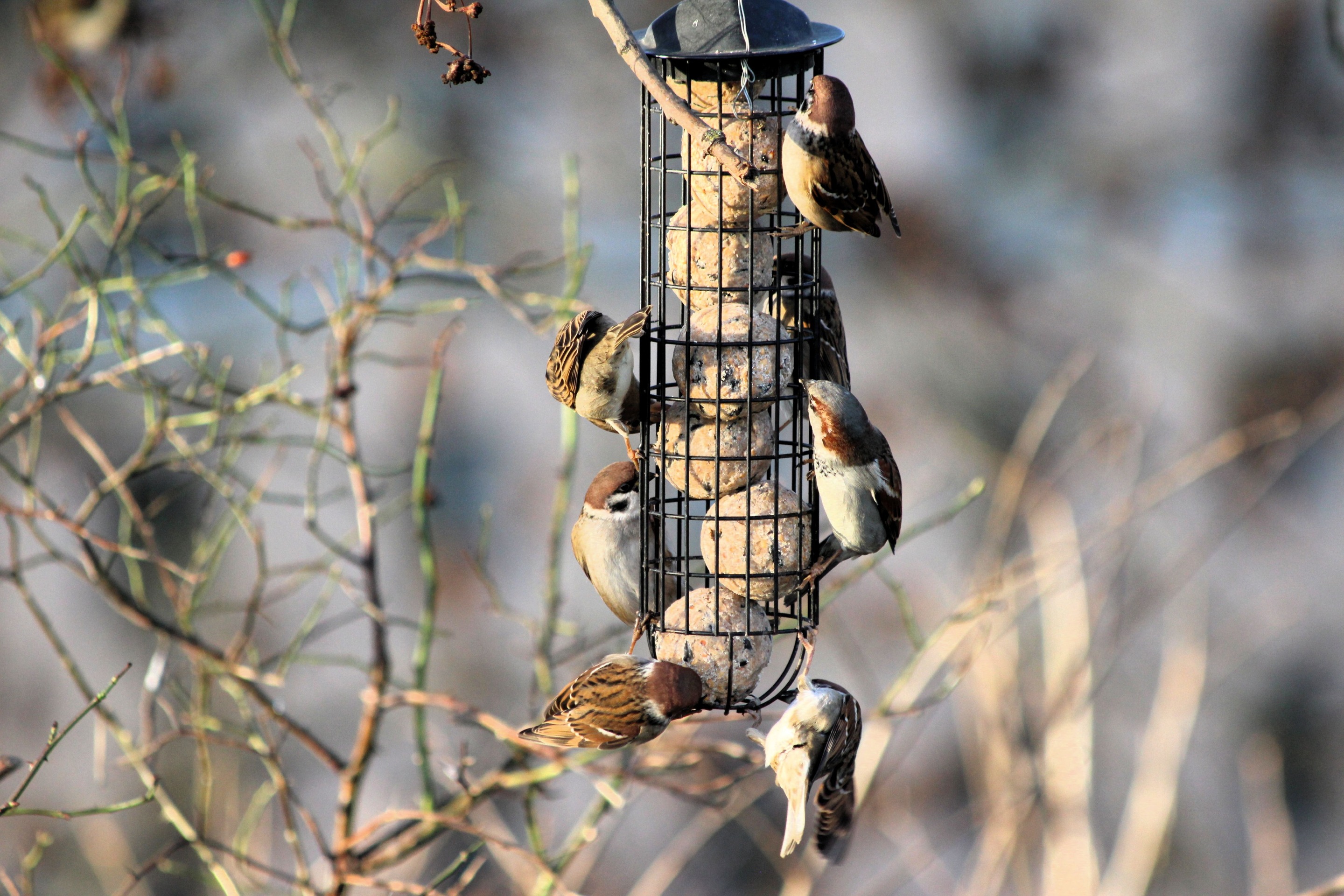 Ett gäng pilfinkar och en gråsparv vid matstation.
