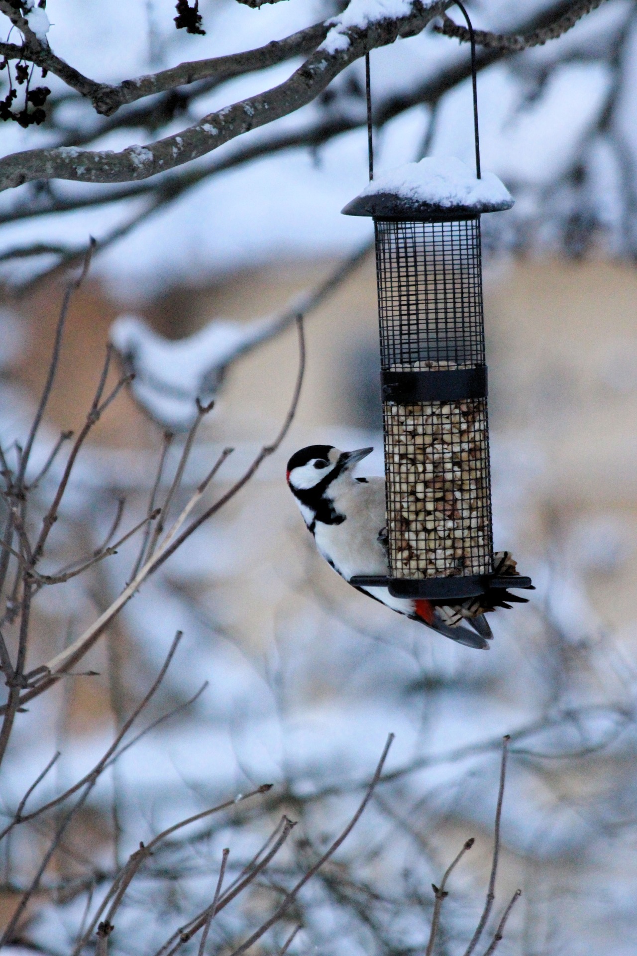 En större hackspett (hane) sitter vid en nötmatare och äter under vintern. Fågeln klamrar sig fast vid gallret medan snö täcker grenarna runt omkring. Den röda fläcken i nacken avslöjar att det är en hane. En vardaglig men vacker naturupplevelse i trädgården, fotograferad i mjukt vinterljus.
