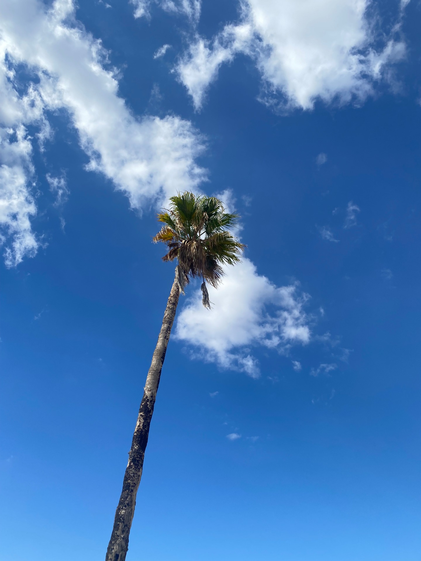 Perspektivet från marken fångar palmens styrka mot den klaraste blå.